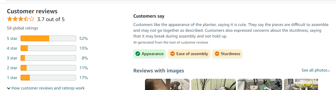 进一步分析发现,顾客抱怨这款花盆组装起来不容易,而且不够结实。我们可以改进自己的产品,例如提供更详细的组装说明。我们甚至可以与制造商协商,让他们使用更坚固的材料。